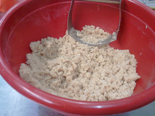 Mix together the flour, sugar and cinnamon. Cube the butter and cut it into the flour mix. Set aside until you're ready to assemble the pie.